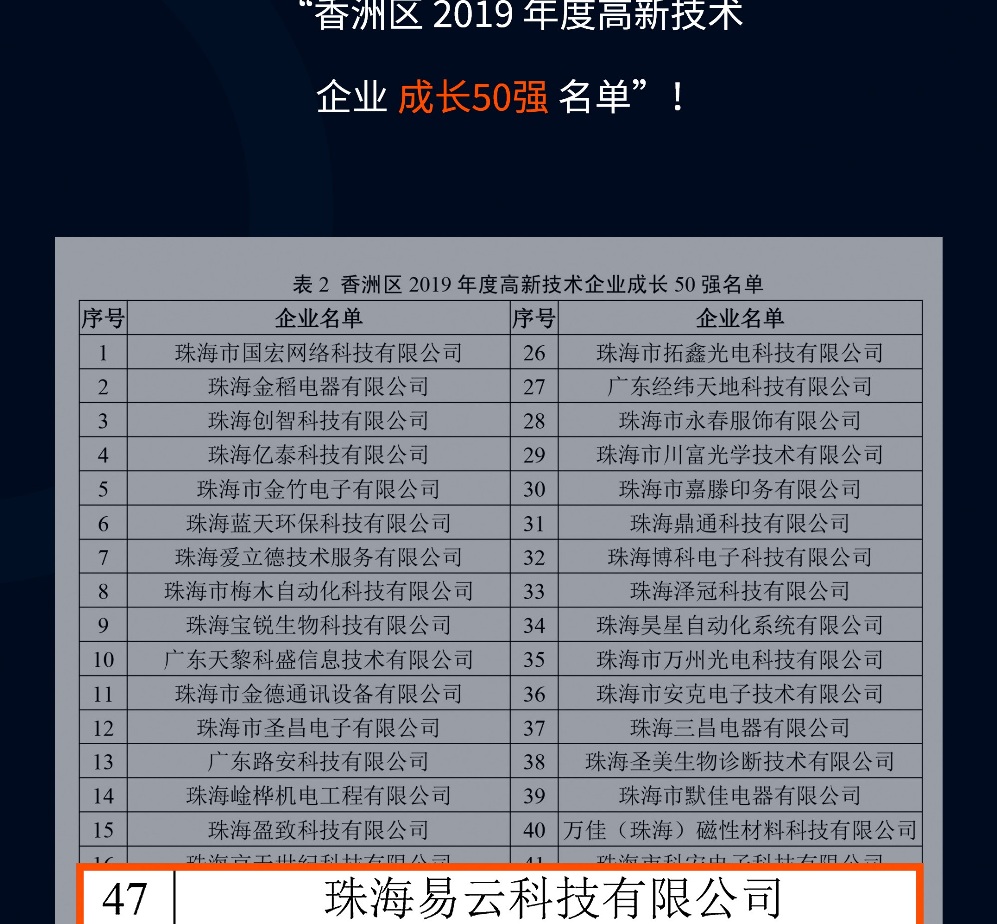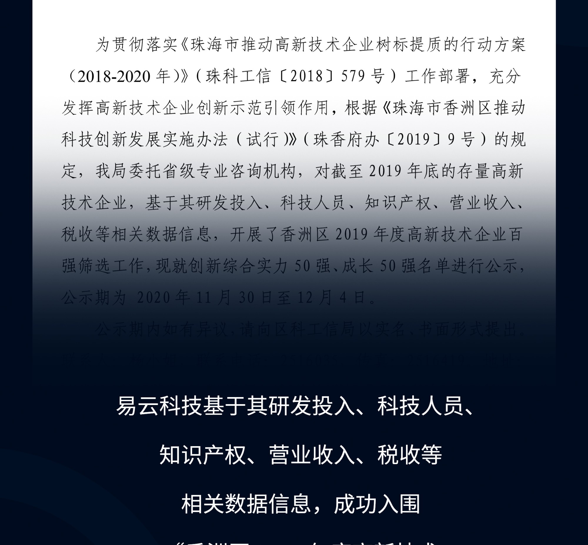 喜報(bào):易云科技入圍香洲區(qū)高企百?gòu)?qiáng)名單!