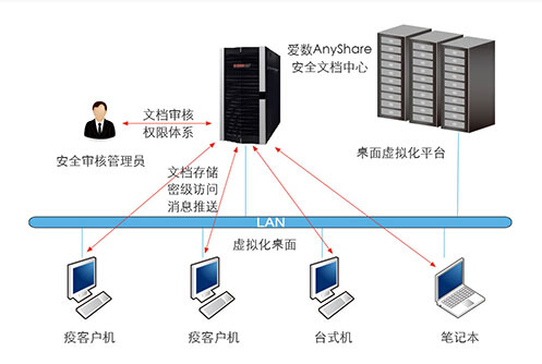 越來(lái)越多的組織機(jī)構(gòu)采用桌面虛擬化方案,將傳統(tǒng)PC替換為在數(shù)據(jù)中心的服務(wù)器與存儲(chǔ)上運(yùn)行的虛擬桌面。用戶具有從任何位置訪問(wèn)其桌面的優(yōu)勢(shì),但同時(shí)仍然擁有自己的個(gè)性化桌面環(huán)境。以集中方式管理和支持桌面可以提高靈活性、縮短響應(yīng)時(shí)間并減少運(yùn)營(yíng)成本。然而虛擬化桌面PC應(yīng)用中,仍然有很多文檔產(chǎn)生、使用、共享等需求。本方案采用愛(ài)數(shù)AnyShare文檔柜,為組織機(jī)構(gòu)建一個(gè)適用于桌面虛擬化環(huán)境的文檔集中存儲(chǔ)共享管理解決方案。為虛擬化桌面用戶提供文檔數(shù)據(jù)集中存儲(chǔ)與統(tǒng)一共享管理,可以通過(guò)更好的管理輕松實(shí)現(xiàn)內(nèi)部文件統(tǒng)一訪問(wèn)、共享與交互協(xié)作,并且對(duì)集中存儲(chǔ)的文檔進(jìn)行統(tǒng)一的安全管理。另一方面可以通過(guò)企業(yè)庫(kù)等功能對(duì)知識(shí)文檔進(jìn)行組織,加快知識(shí)分享與學(xué)習(xí),與桌面虛擬化整合方案應(yīng)用,提升文檔存儲(chǔ)管理效率、文檔安全管理與共享管理。應(yīng)用方案示意圖如下: