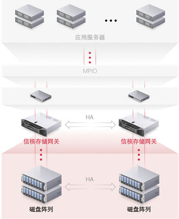 信核存儲級高可用解決方案是      家從網絡層實現存儲高可用的解決方案。通過存儲專用SAN網絡傳輸數據,不經過前端應用網絡,不影響業務的正常運行。