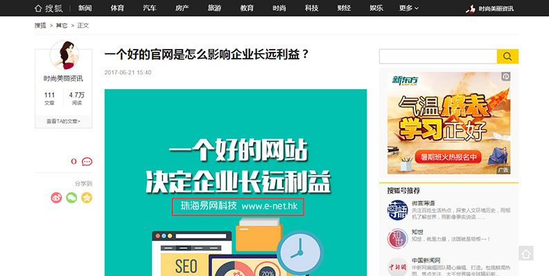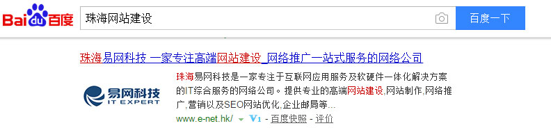 例如:易網科技是一家專注于網站建設和網絡推廣的公司,搜索關鍵詞“珠海網站建設”(用戶搜索量非常大的詞),就可以在百度 首頁找到易網科技官網。